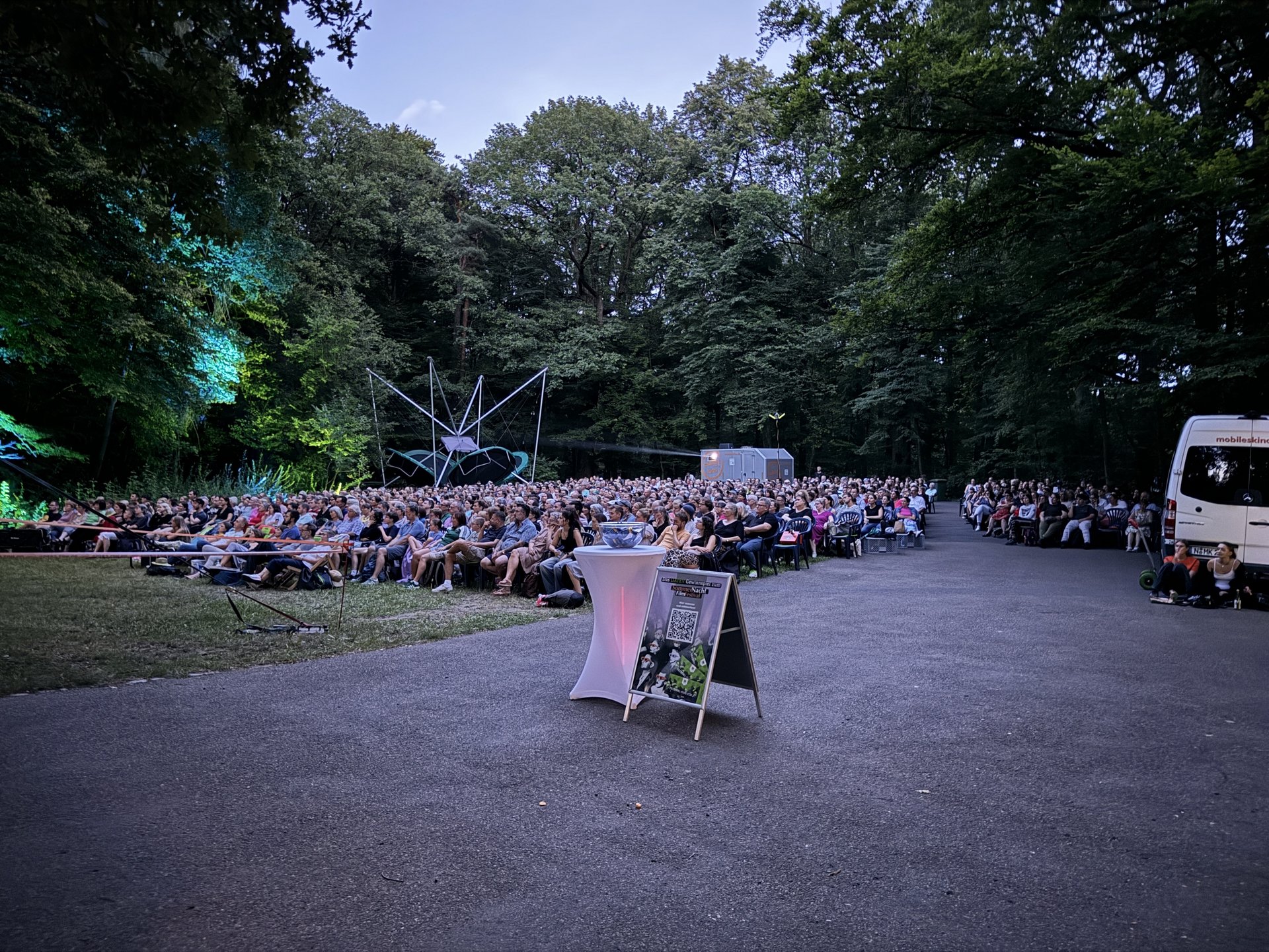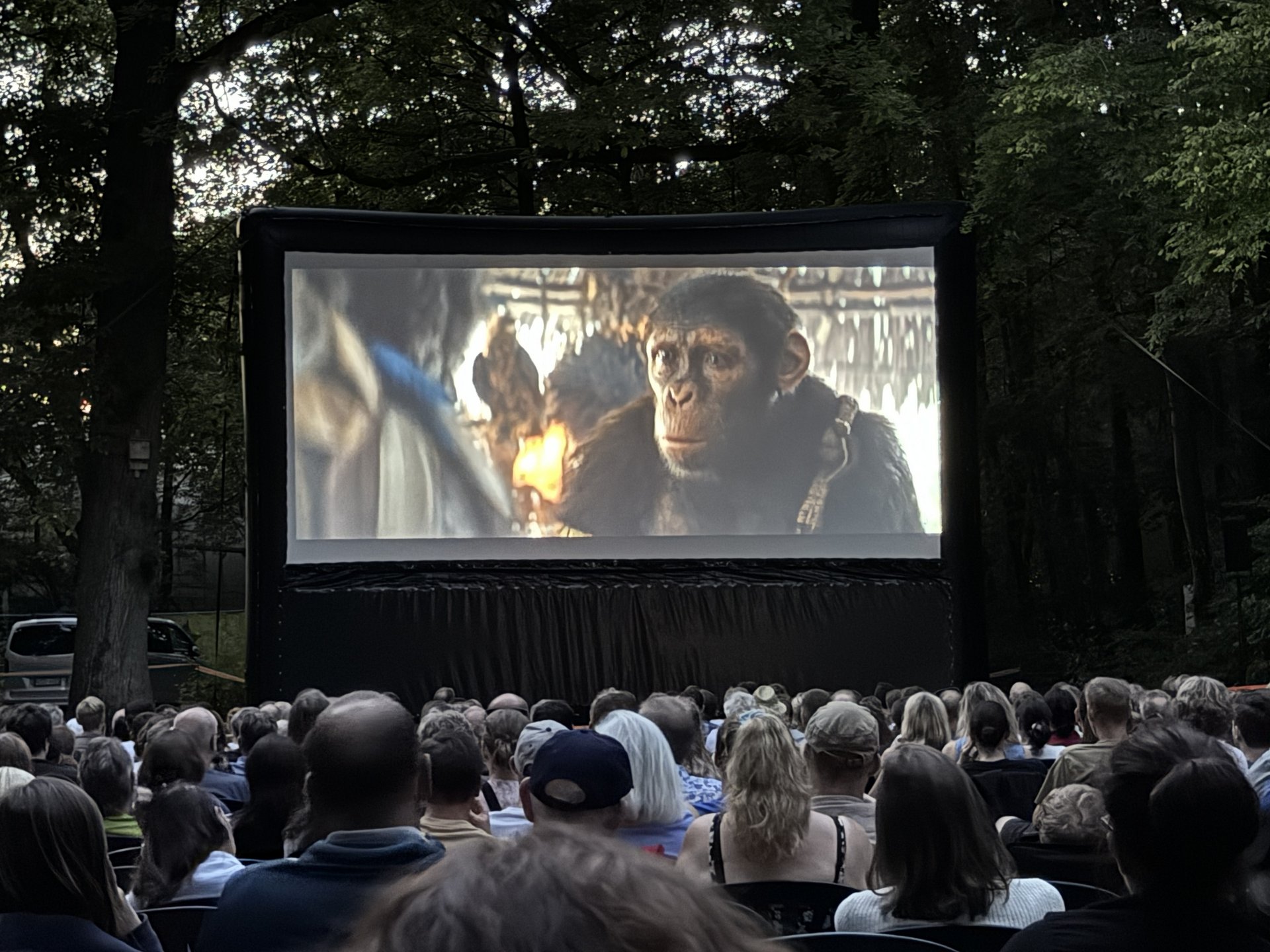 Leinwand und Bestuhlung sind vor dem Steinbockgehege aufgebaut. Und im letzten Abendlicht werfen wir dann den Projektor an.
